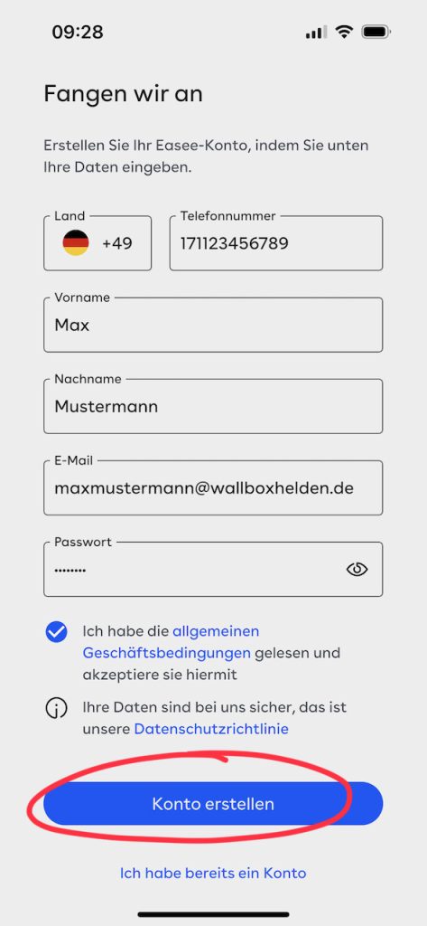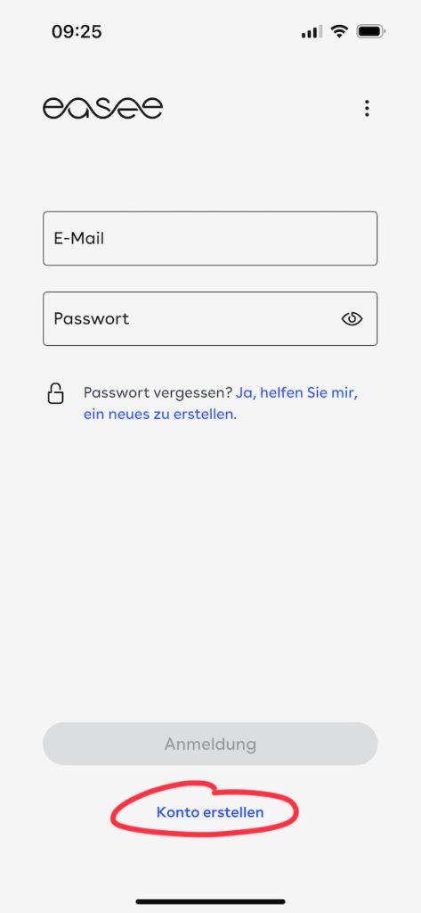 Öffnen Sie die easee-App, tippen Sie ganz unten auf „Konto erstellen“.