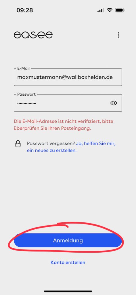 Wechseln Sie dann wieder zurück zur easee-App und tippen Sie dort auf „Anmeldung“.