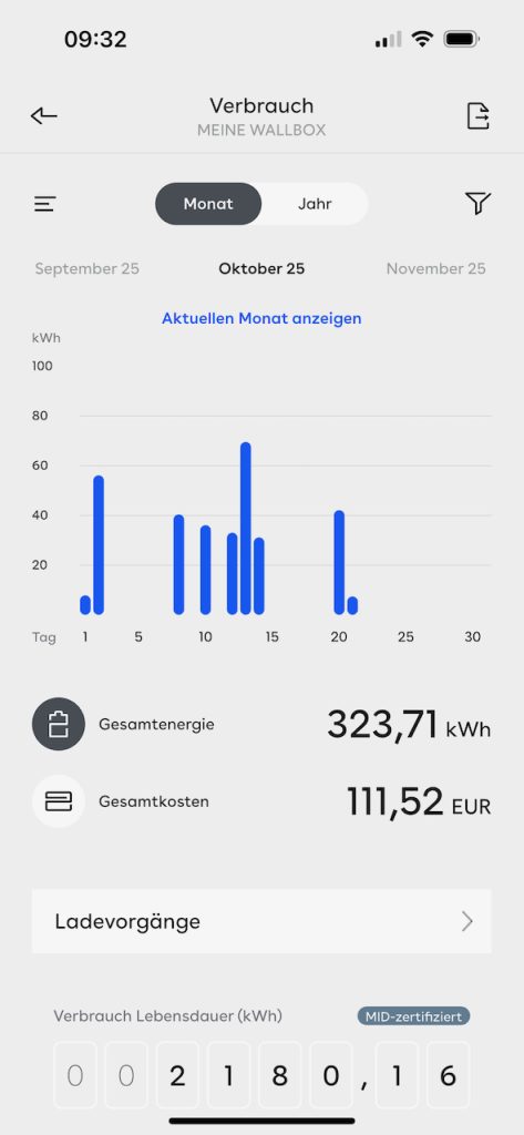 Sie können zwischen Jahres- und Monatsansicht wechseln und beim Antippen einer blauen Säule erhalten Sie die an diesem Tag geladene Leistung in kWh.