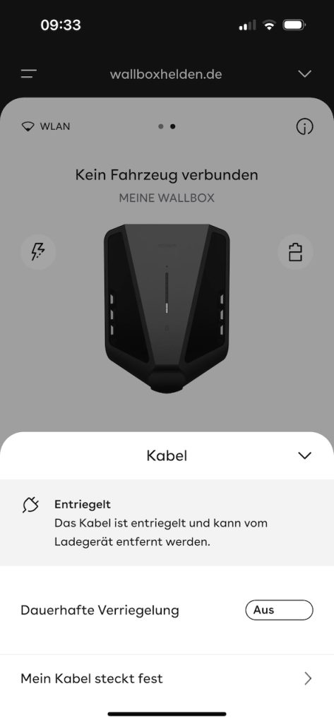 Das Antippen der Schaltfläche „Kabelverriegelung“ öffnet ein Menü, in dem Sie die dauerhafte Verriegelung des Typ2-Ladesteckers in der Wallbox aktivieren können.