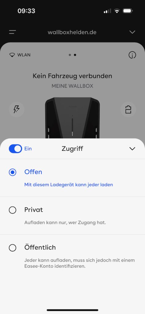 Im Privatbereich werden Sie meist die Option „Offen“ nutzen, das heißt, beim Anstecken des Autos startet sofort der Ladevorgang.