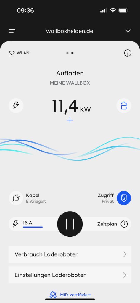 Die anmierte blaue Welle symbolisiert den laufenden Ladevorgang, die aktuelle Ladeleistung wird angezeigt und durch Tippen auf die kW-Zahl sehen Sie detailliert die Leistung pro Phase.